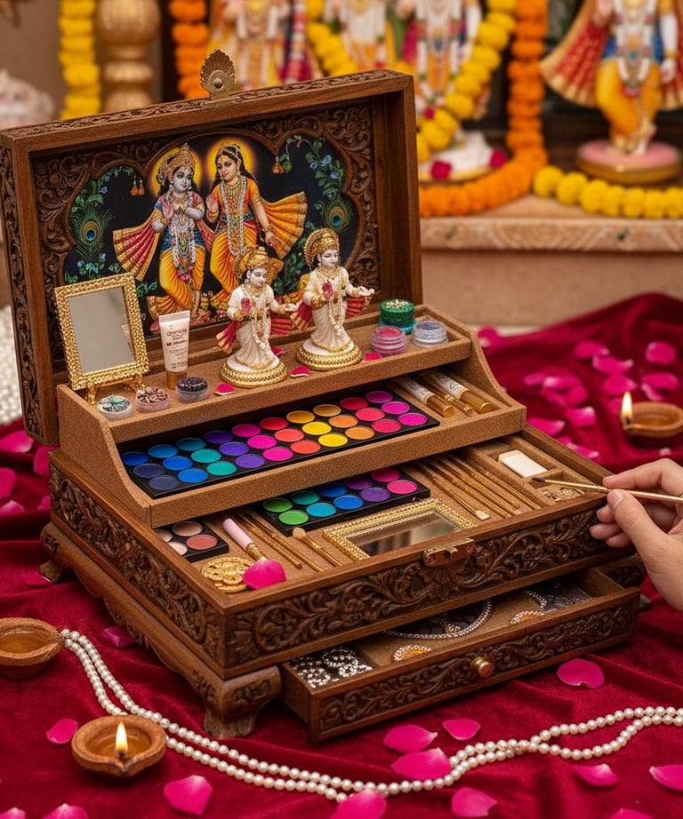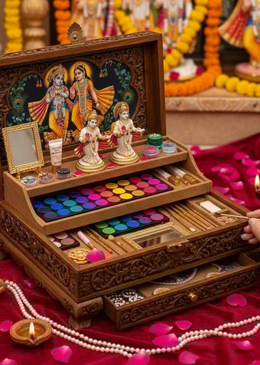 We offer premium idol makeup kits, shringar accessories, and costumes, ensuring every deity is adorned with glamour and grace for every occasion.